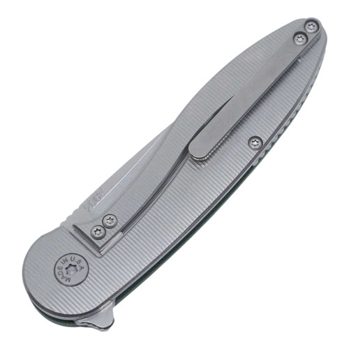 The all-new Model 1 in a titanium frame lock. The blade is made of 20Cv stainless and has been heat-treated and cryogenically tempered. The blade is 3D milled and has a satin stone-wash finish. The blade rides on ceramic caged bearings and hardened stainless thrust washers. Ceramic detent ball. The pivot and pivot screw has been made from hardened 416 stainless. The backspacer is made from titanium. The pocket clip is made from titanium.