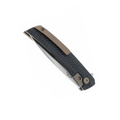 • Carbon Fiber scales, titanium liners, hardware, shield inlay, and clip.