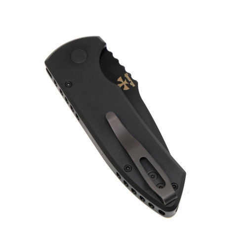 This Custom Pro-Tech SBR is a smaller, lighter, and more pocketable version of the popular Rockeye, hence the name SBR, or Short Bladed Rockeye. It's designed by Les George and features a custom blue and red micarta scale.