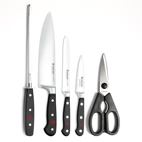 - Wüsthof gourmet series – 10-piece knife set with triple riveted synthetic polypropylene handles that resist fading, discoloration, heat, and impact. Precisely laser-cut stamped knives offer superb quality and value
